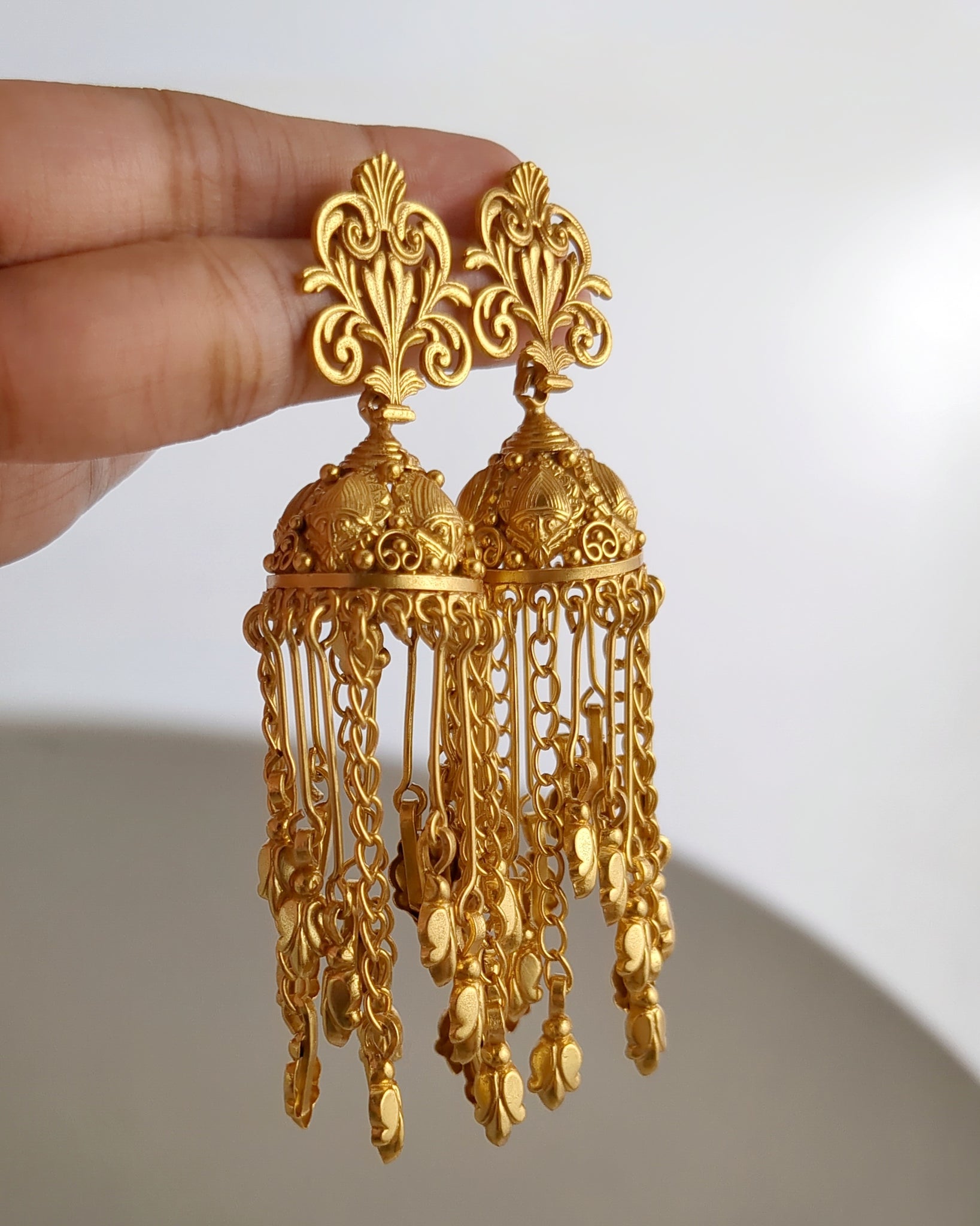 Elegant, gold-plated silver Jhumki earrings crafted by hand for a timeless look. These delicate danglers feature authentic 925 silver with a luxurious gold plating that delivers genuine gold feel and finish. At 8 cm in length with a refined 1 cm width, they're perfectly sized for everyday elegance. Secured with simple posts for comfortable wear. Each pair is meticulously handmade to ensure quality and uniqueness. Perfect for adding a touch of traditional charm to any occasion.