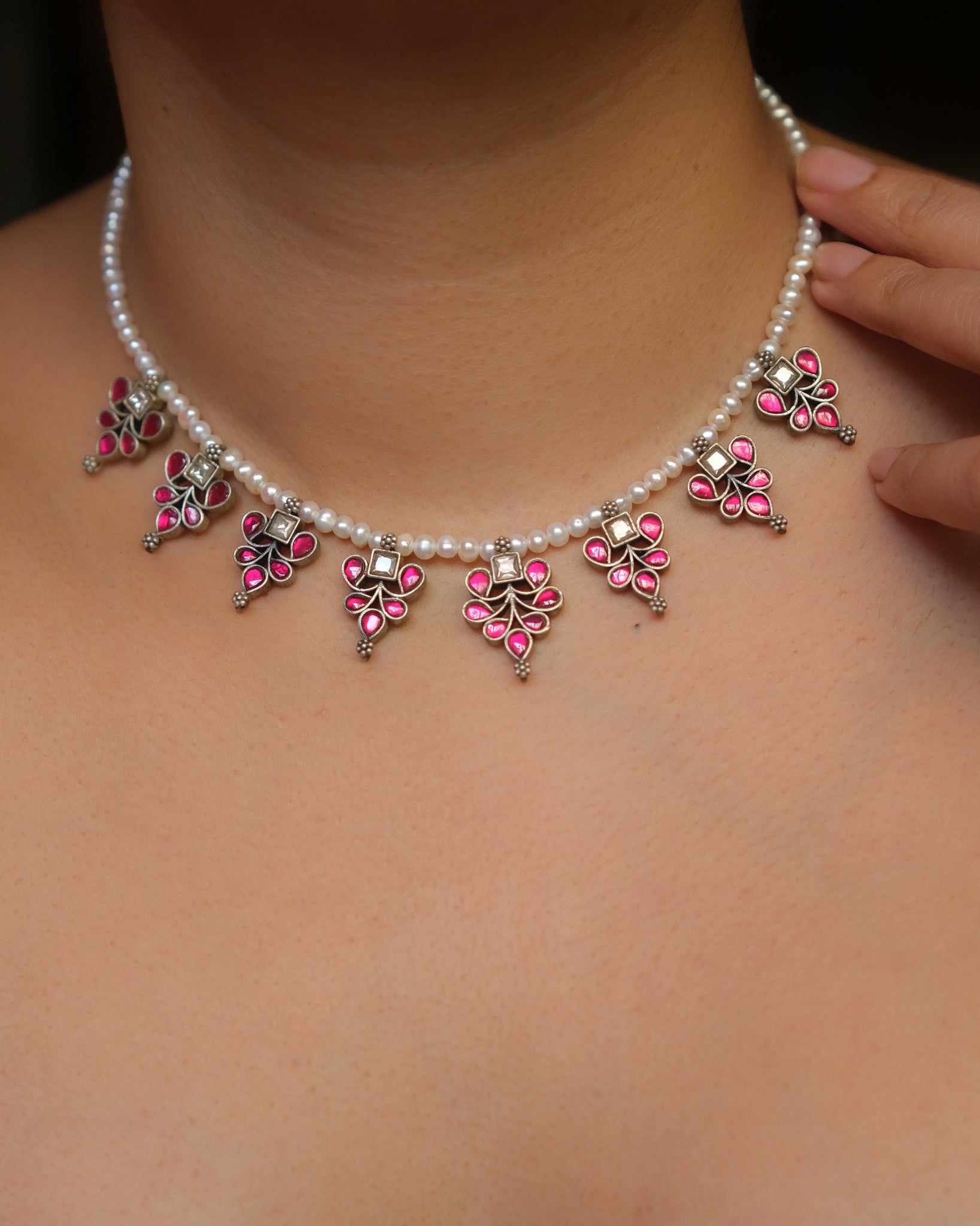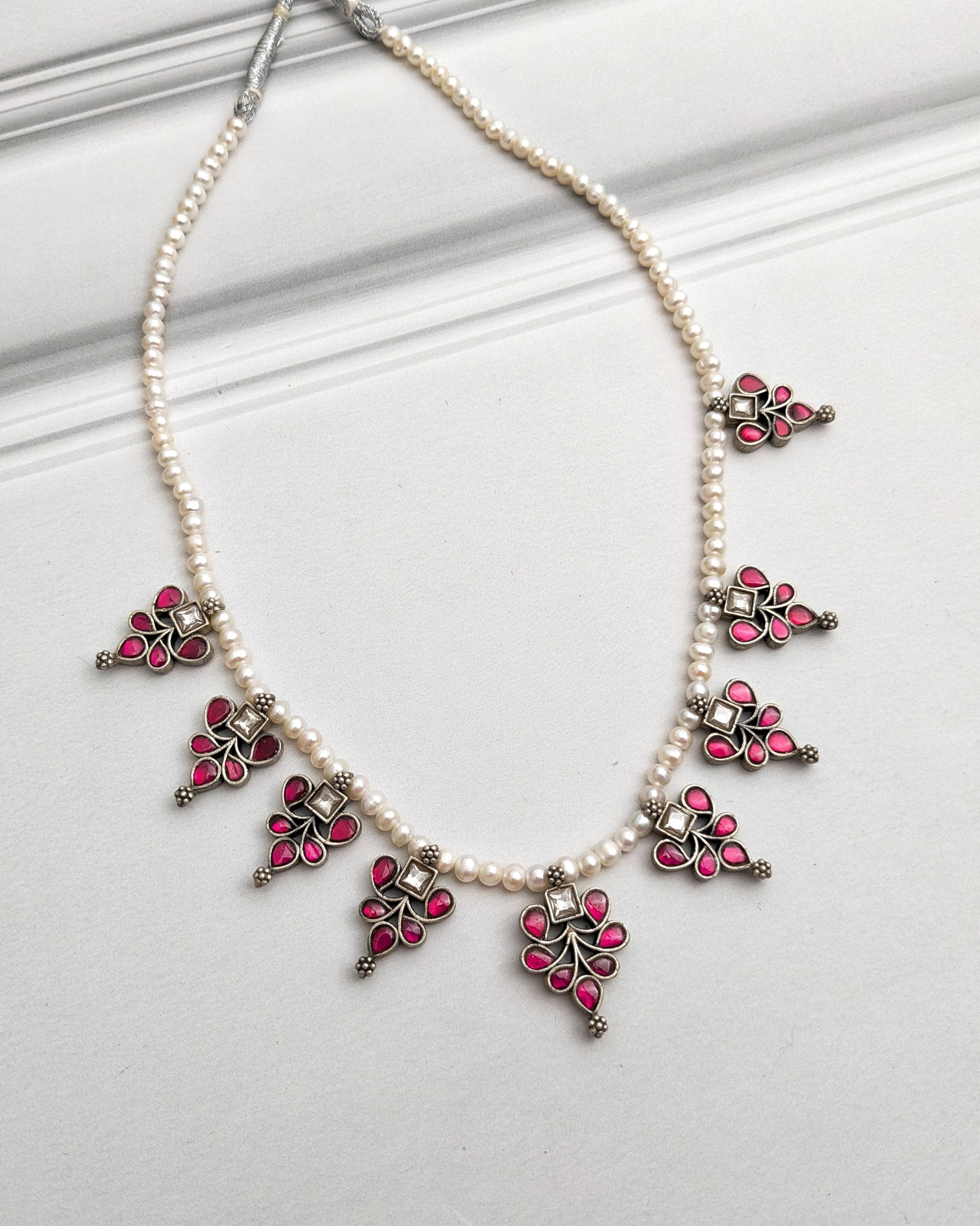 Single line natural pearl necklace with silver kundan pendants with pink kundan setting