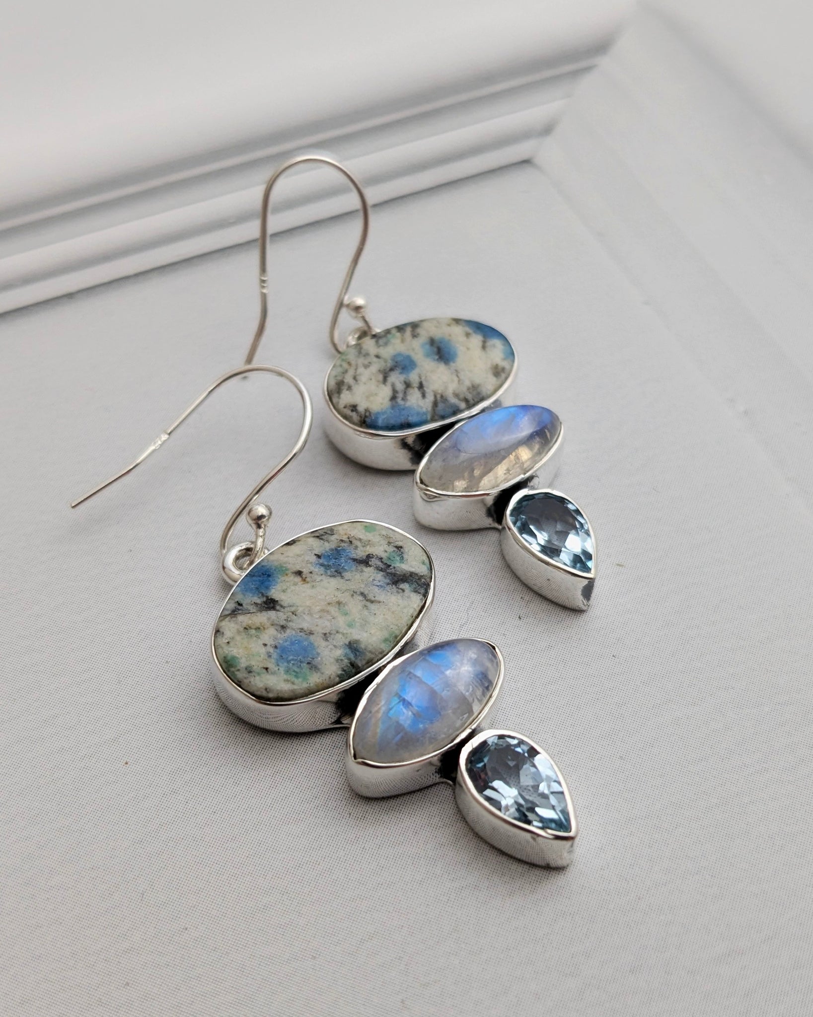 Elegant drop earrings crafted in 925 silver, featuring a stunning combination of lapis lazuli, lapis lace, and blue topaz. The azure sky-inspired palette brings cool, calming tones to any look. Simple hook fastening ensures comfortable, everyday wear. Each earring measures 4.5 cm in length and 1.5 cm in width, offering a graceful drape without overwhelming the face. Perfect for those who appreciate natural gemstones and timeless silver jewelry.