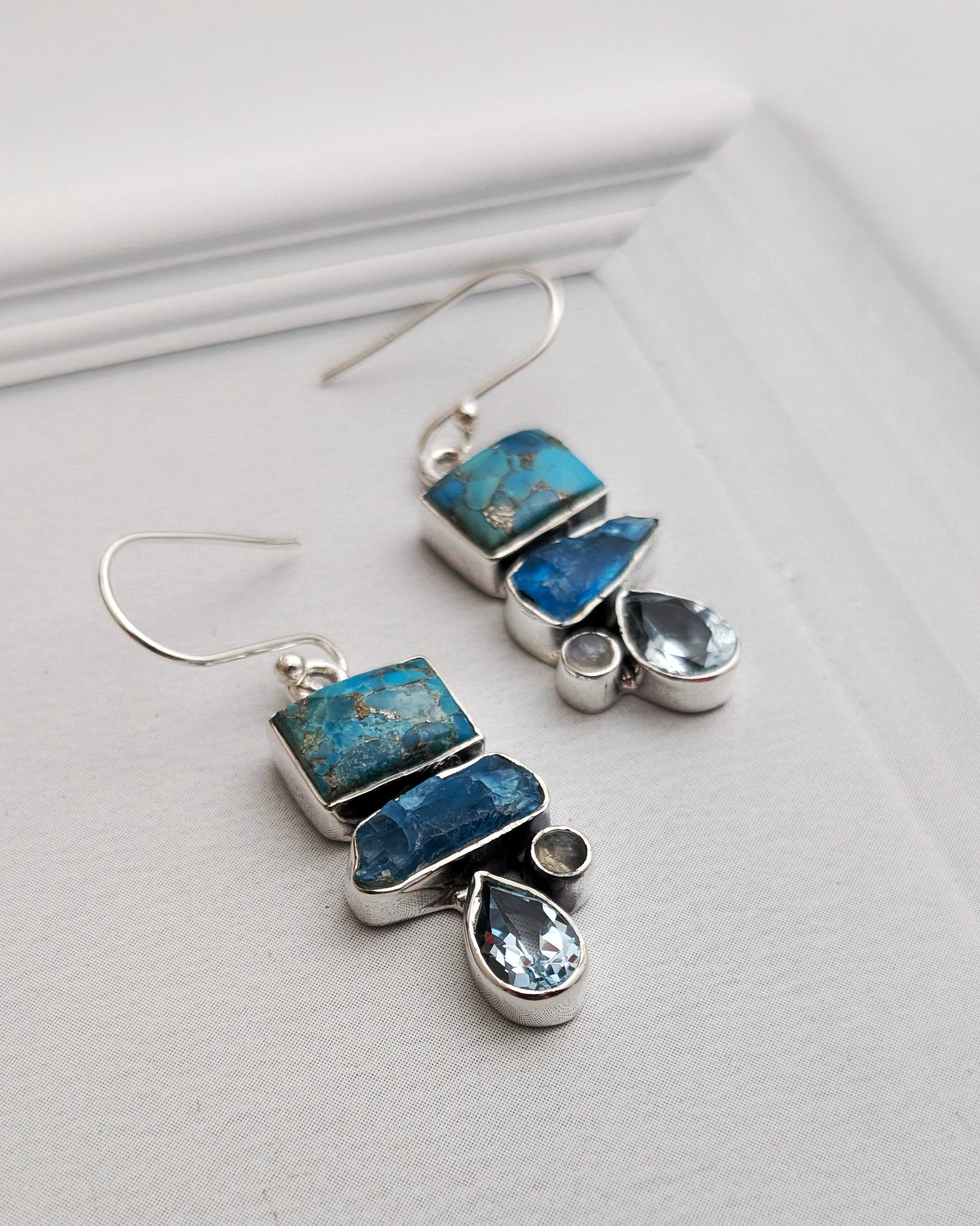 Elegant silver hook earrings featuring a captivating blend of blue gemstones. Each pair showcases turquoise, slice apatite, blue topaz, and moonstone set in 925 silver, creating a serene, sophisticated aesthetic. The simple hook fastening ensures comfortable all-day wear. Measuring 4.5 cm in length and 1.5 cm in width, these versatile pieces add a touch of timeless elegance to any look.